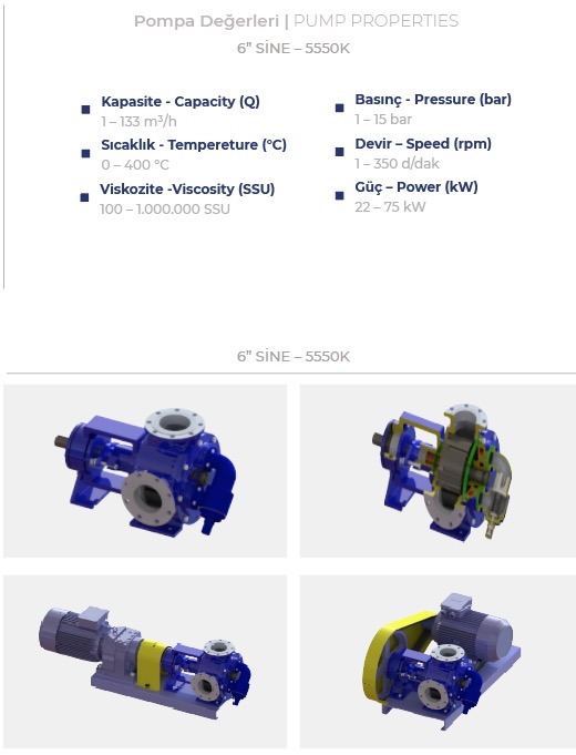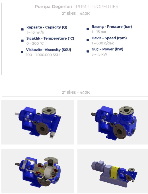Her iki yönde de çalışma özelliğine sahip bu pompalar geniş bir viskozite aralığına ek olarak geniş bir sıcaklık aralığına da sahiptirler. İmalatımız olan içten eksantrik dişli pompalar sıcaklığı 370 ºC' ye kadar olan sıvılarda kullanılabilirler ve çıkış basınçları sıvının viskozitesine bağlı olarak maksimum 14 bar' dır. Pompanın çalışması esnasında, çevre dişli pompa milinden aldığı dönme hareketini avare dişliye iletir.