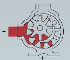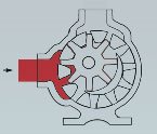 1- Üstteki renkli kısım sıvının pompa gövdesindeki emiş ağzı alanına ve rotor dişleri ve avare dişlisi dişleri arasındaki dişli boşluğu alanına girişini gösterir.İki siyah ok pompanın dönüş ve sıvının ilerleyişini gösterir.